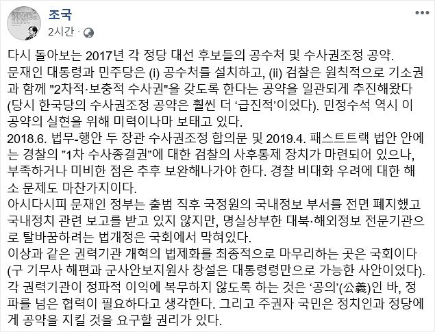 조국 페이스북에 대선 후보들 공수처 공약 공약 지켜야 중앙일보