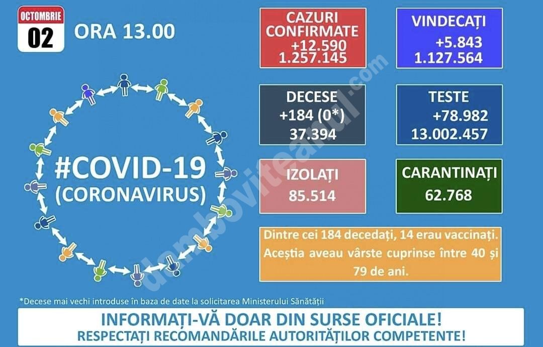 România a depășit 4000 de cazuri noi de COVID pe zi. Bilanț COVID-19 din 1 octombrie 2021 în România. In municipiul Suceava situatia epidemiologica se agraveaza in ritm accelerat.