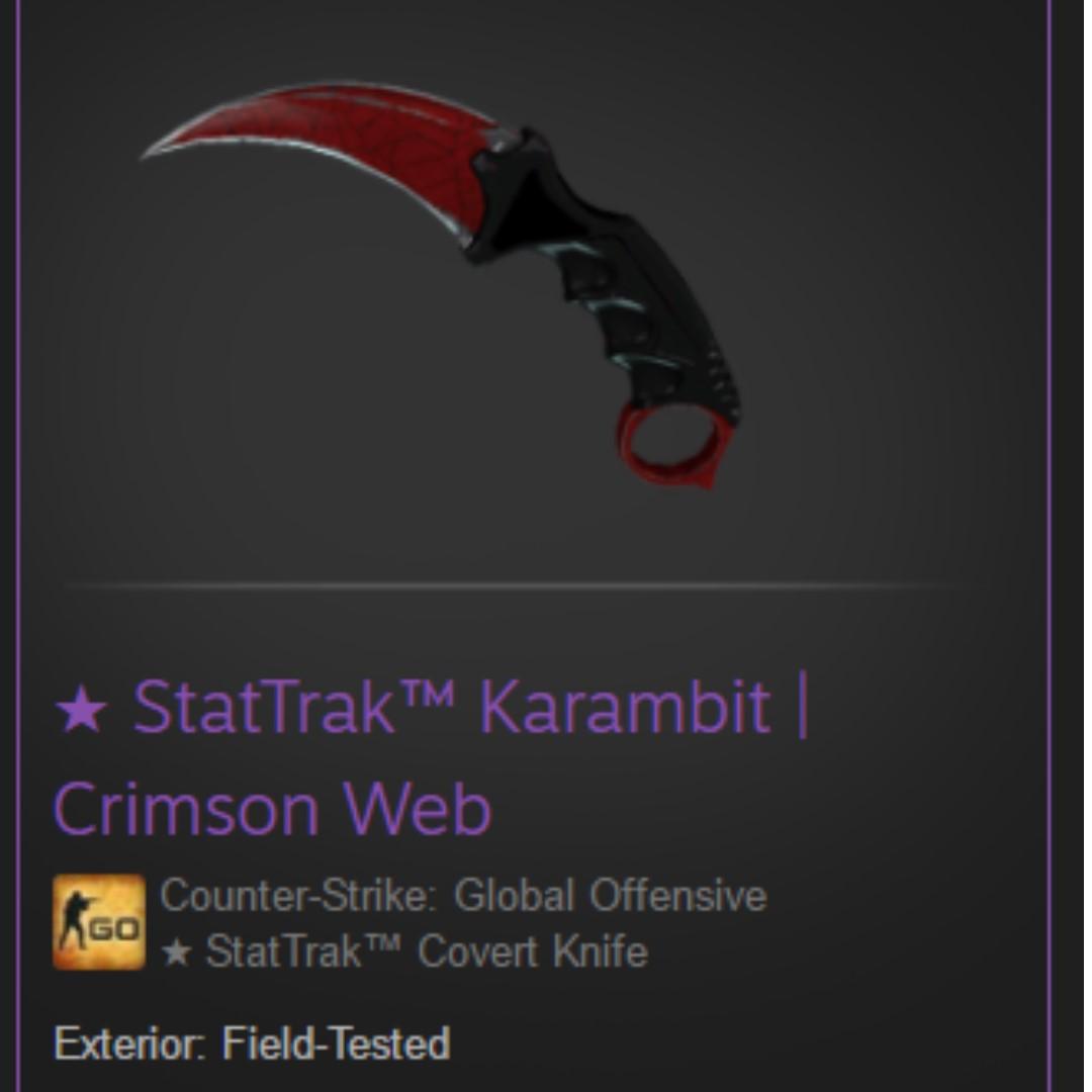 StatTrak Karambit Crimson Web Field-Tested - Counter-Strike. Global Offensive CSGO Skins DOTA2 Skins PLAYERUNKNOWNS BATTLEGROUNDS PUBG Skins Weapons Prices and Trends Trade Calculator Inventory Worth Player Inventories Top Inventories Bitskins Hot Deals Bitskins Lowest Prices Price list Item Database Giveaways. Global Offensive StatTrak Karambit Crimson Web Minimal Wear The appearance of items in the individual listings may vary slightly from the one above.